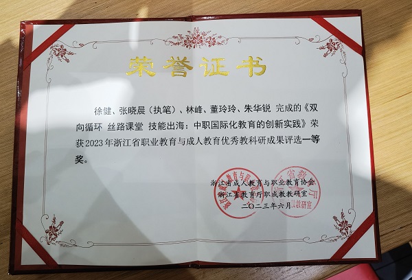 近日,浙江省成人教育与职业教育协会、浙江省教育厅职成教教研室公布了2023年浙江省职业教育与成人教育优秀教科研成果获奖名单,由徐健校长领衔的《双向循环技能出海:中职国际化教育的创新实践》荣获一等奖。