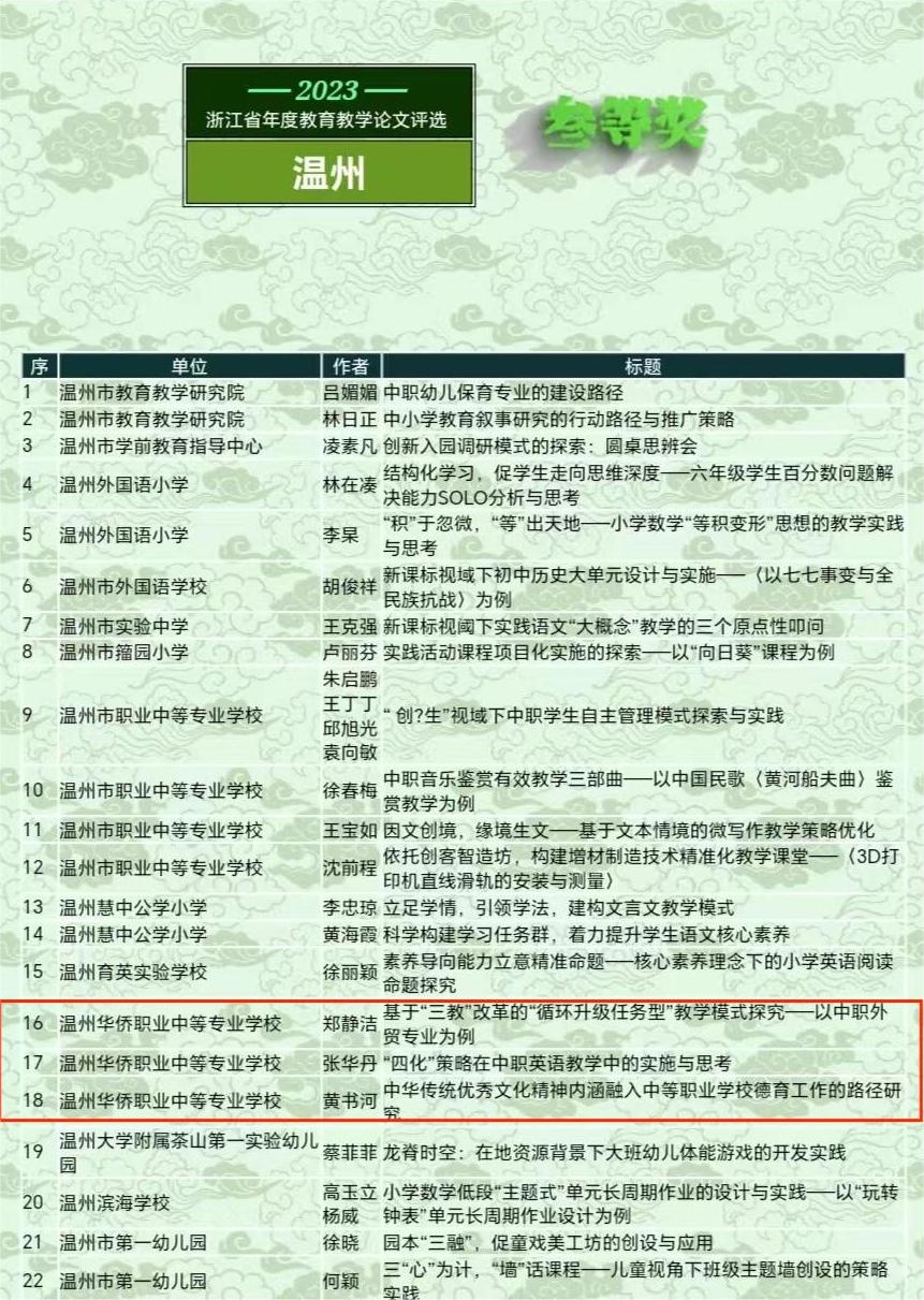 近日,2023年温州市中小学(幼儿园)教师优秀教育教学论文评选结果揭晓,我校共荣获一等一项、二、三等奖各五项的优异成绩。
