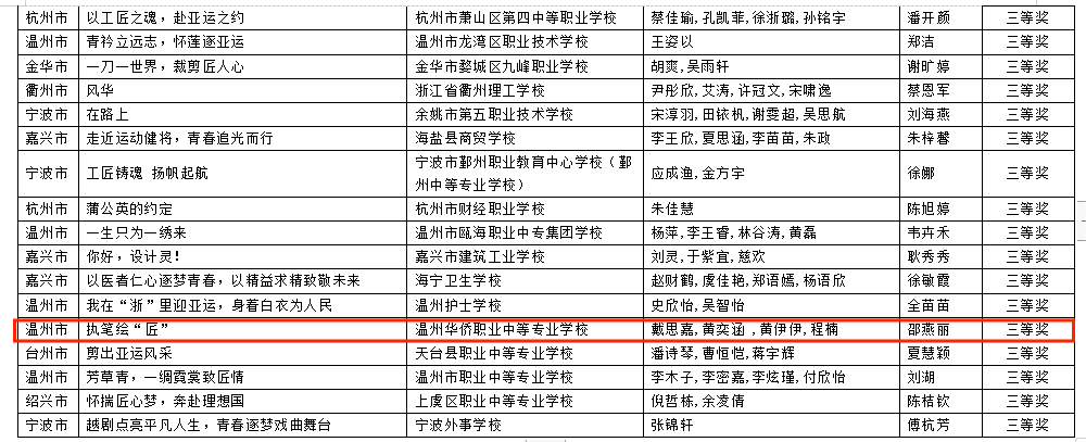 近日,浙江省中等职业学校职业能力大赛组委会办公室揭晓了浙江省第八届“梦想杯”中职学生征文大赛获奖名单,我校金童诗雨、陈建伊《龙腾虎跃夺国冠 踔厉奋进迎亚运》荣获二等奖,指导师张卉;潘艳然、张梦瑶、张文静、林雅妮《匠心•匠行•匠魂—追随一位老者的背影》,戴思嘉、黄奕涵、黄伊伊、程楠《执笔绘“匠”》分别荣获三等奖,指导师均为邵燕丽。